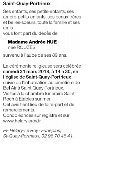 Décédée à Saint-Quay-Portrieux (22410) le jeudi 29 mars 2018 à l'âge de 88 ans