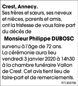 Décédé à Crest (26400) le samedi 28 décembre 2019 à l'âge de 72 ans