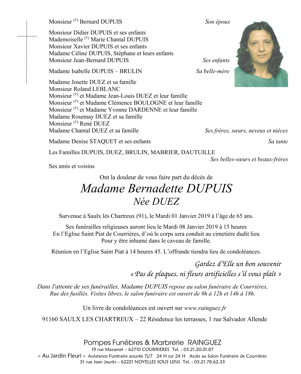 Décédée à Saulx-les-Chartreux (91160) le mardi 1 janvier 2019 à l'âge de 65 ans