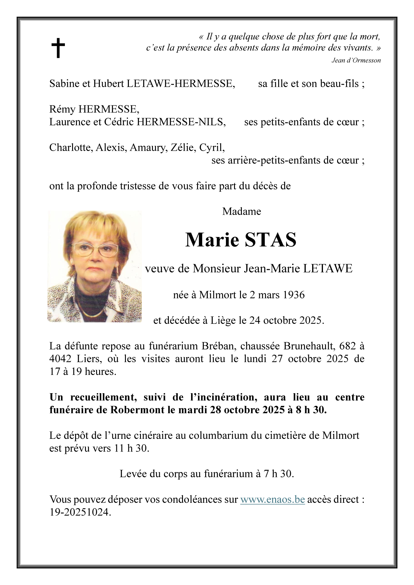 Madame Marie STAS veuve de Jean-Marie LETAWE