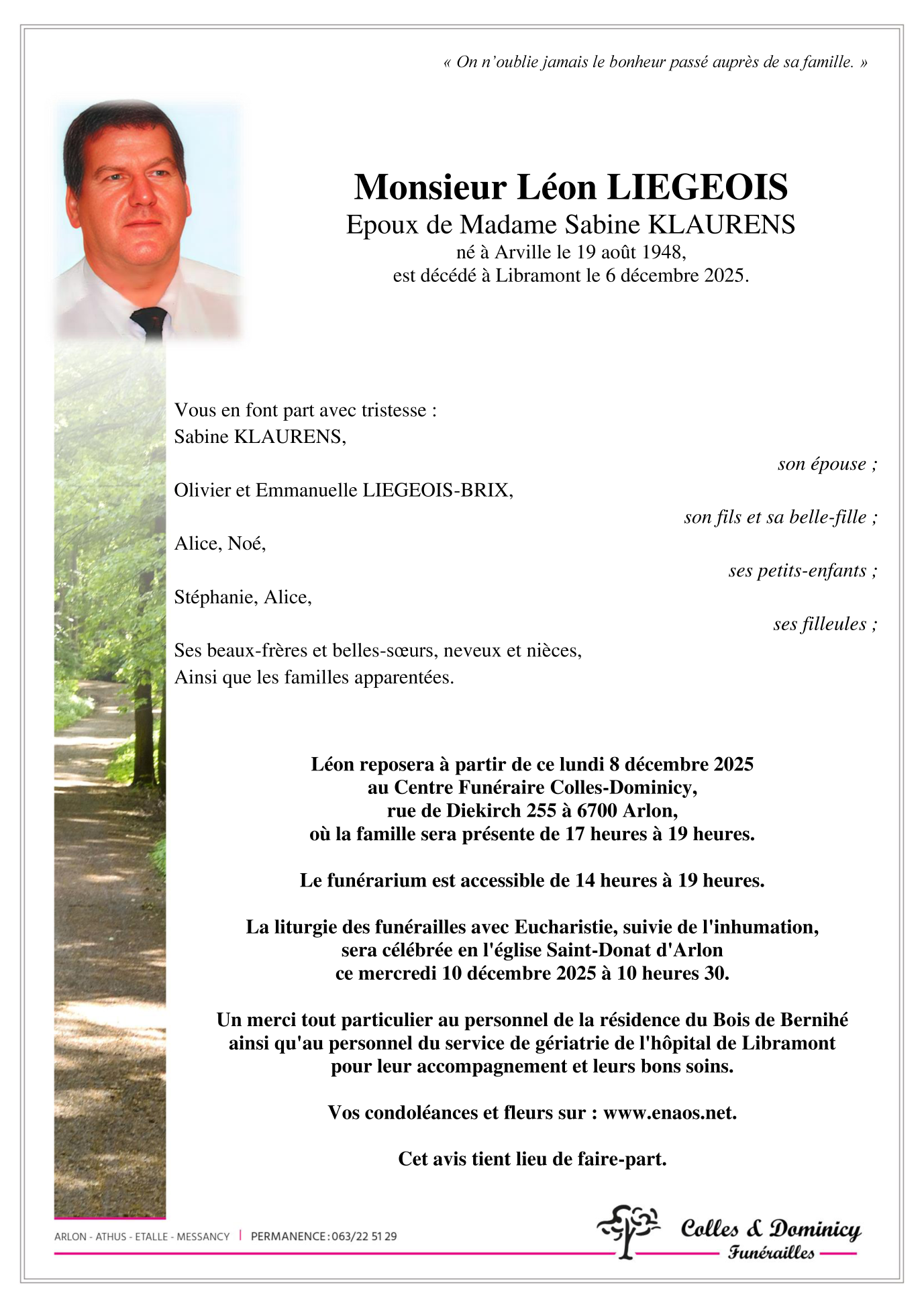 Décédé à Libramont-Chevigny (6800, Belgique) le samedi 6 décembre 2025 à l'âge de 77 ans