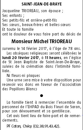 Overleden te Saran (45770) op dinsdag 14 februari 2017 op 78-jarige leeftijd