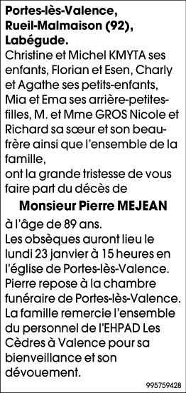 Décédé à Valence (26000) le mercredi 18 janvier 2023 à l'âge de 89 ans