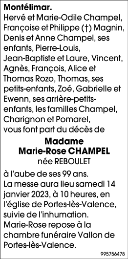 Décédée à Saint-Marcel-lès-Valence (26320) le mardi 10 janvier 2023 à l'âge de 98 ans