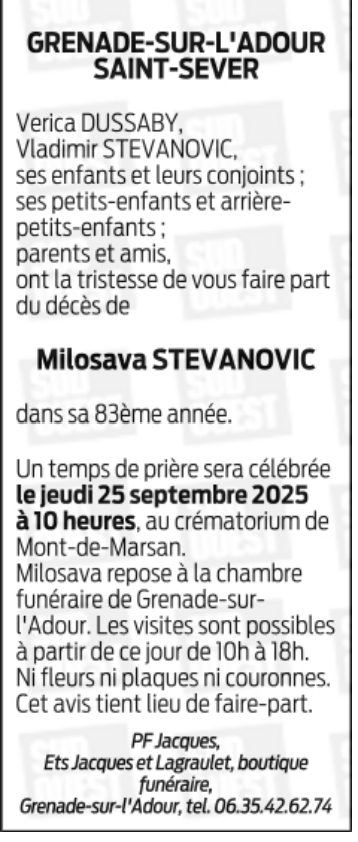 Fallecida en Saint-Sever (40500) el sábado, 20 de septiembre de 2025 a la edad de 82 años