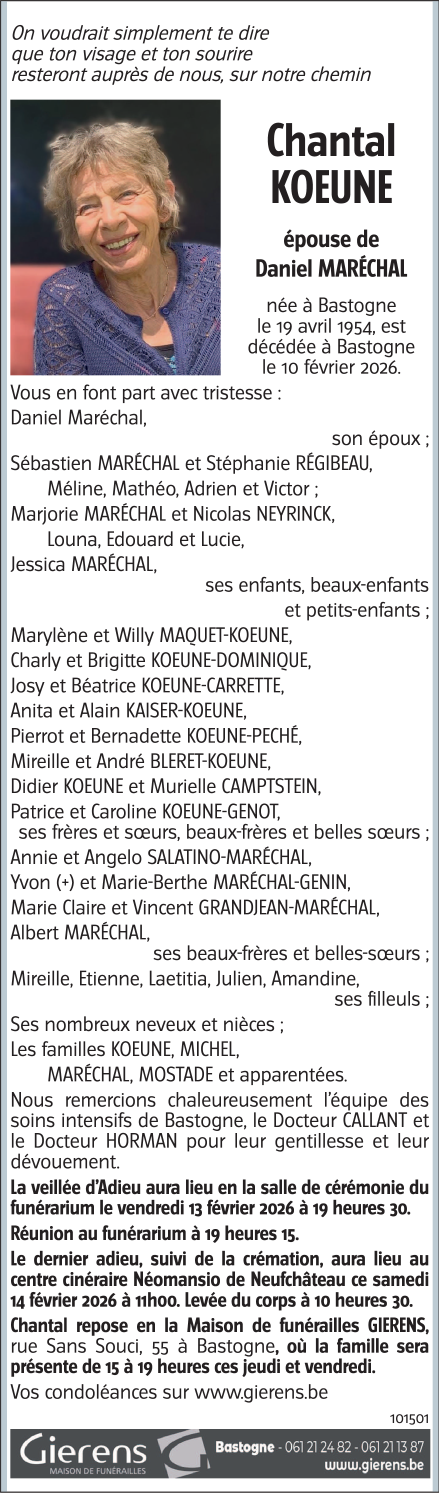 Overleden te Bastogne (6600, België) op dinsdag 10 februari 2026 op 71-jarige leeftijd