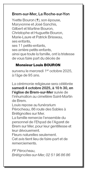Décédé à Les Sables d'Olonne (85340) le mercredi 1 octobre 2025 à l'âge de 95 ans