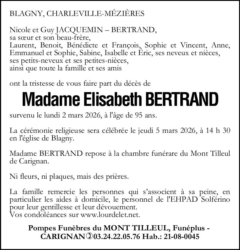 Décédée à Carignan (08110) le lundi 2 mars 2026 à l'âge de 95 ans