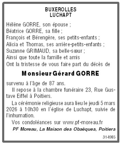 Décédé à Poitiers (86000) le samedi 28 février 2026 à l'âge de 87 ans