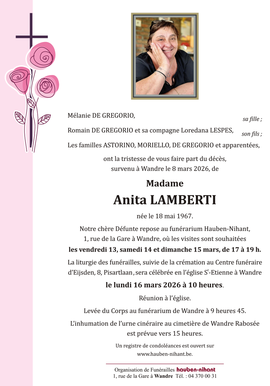 Fallecida en Wandre (4020, Bélgica) el domingo, 8 de marzo de 2026 a la edad de 58 años