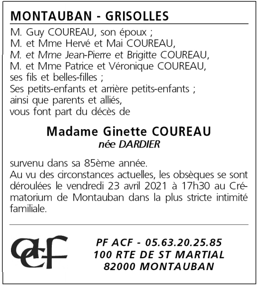 Avis de décès Mme Ginette COUREAU