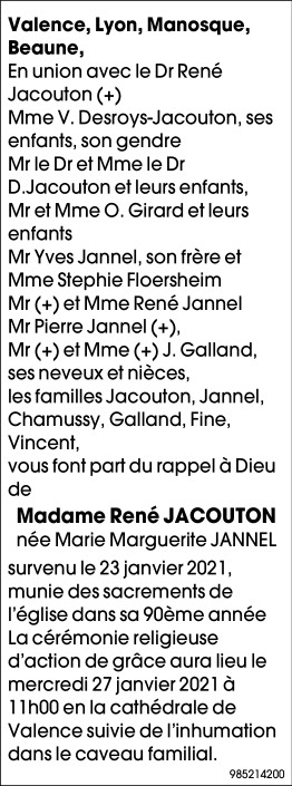 Fallecida en Valence (26000) el sábado, 23 de enero de 2021 a la edad de 89 años