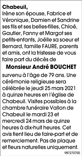 Overleden te Valence (26000) op zondag 21 maart 2021 op 79-jarige leeftijd