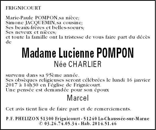 Décédée à Loisy-sur-Marne (51300) le jeudi 12 janvier 2017 à l'âge de 94 ans