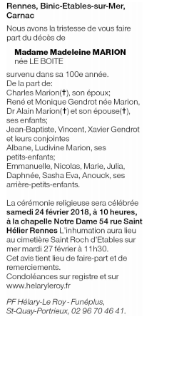 Décédée à Rennes (35000) le mercredi 21 février 2018 à l'âge de 100 ans