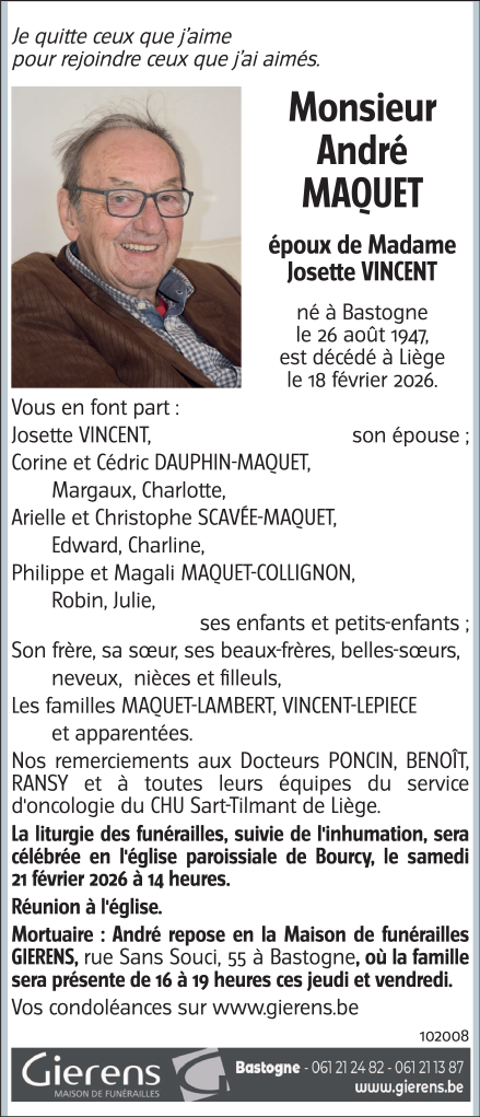 Décédé à Liège (4000, Belgique) le mercredi 18 février 2026 à l'âge de 78 ans