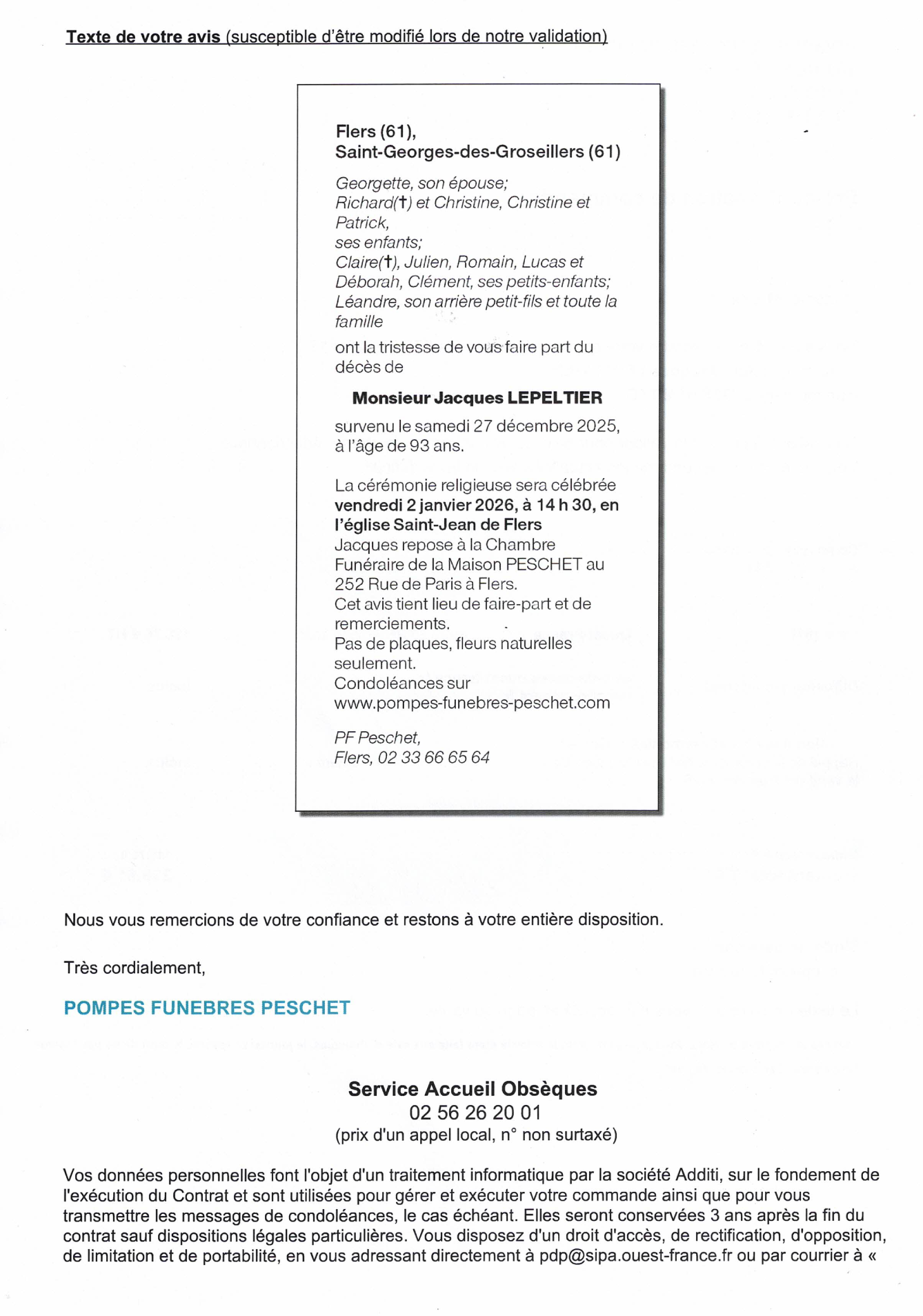Died in Condé sur Noireau (14110) on 27 December 2025 at the age of 93 years