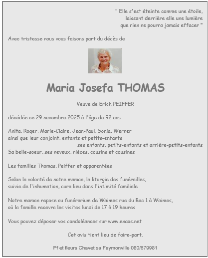 Décédée à Saint-Vith (4780, Belgique) le samedi 29 novembre 2025 à l'âge de 92 ans