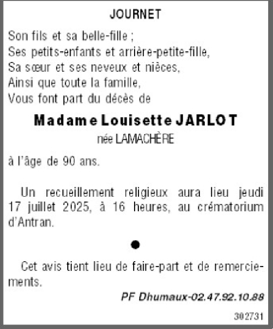 Décédée à Pleumartin (86450) le jeudi 10 juillet 2025 à l'âge de 90 ans