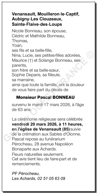 Décédé à Venansault (85190) le mardi 17 mars 2026 à l'âge de 63 ans
