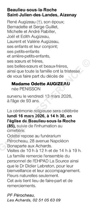 Décédée à Beaulieu-sous-la-Roche (85190) le vendredi 13 mars 2026 à l'âge de 93 ans
