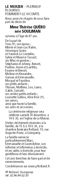 Décédée à Pabu (22200) le mercredi 15 décembre 2021 à l'âge de 87 ans