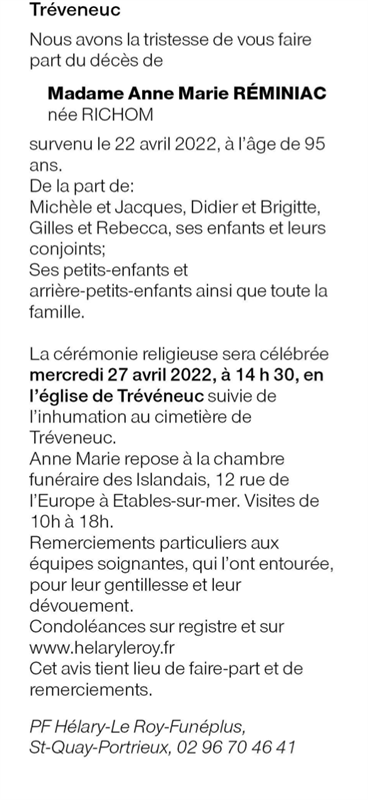 Décédée à Tréveneuc (22410) le vendredi 22 avril 2022 à l'âge de 95 ans