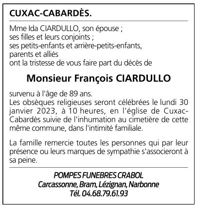 Overleden te Carcassonne (11000) op woensdag 25 januari 2023 op 89-jarige leeftijd