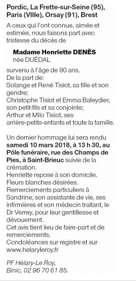 Décédée à Saint-Brieuc (22000) le mardi 6 mars 2018 à l'âge de 90 ans