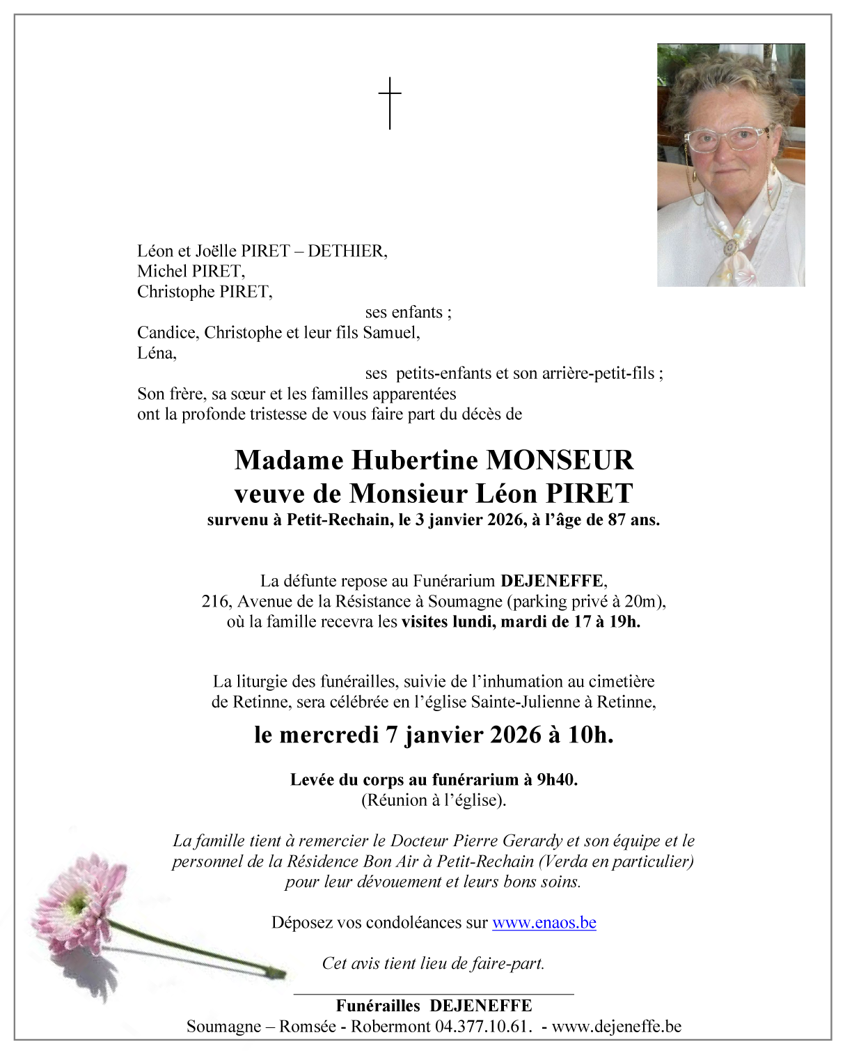 Décédée à Petit-Rechain (4800, Belgique) le samedi 3 janvier 2026 à l'âge de 87 ans
