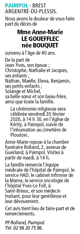 Décédée à Paimpol (22500) le samedi 14 février 2026 à l'âge de 80 ans