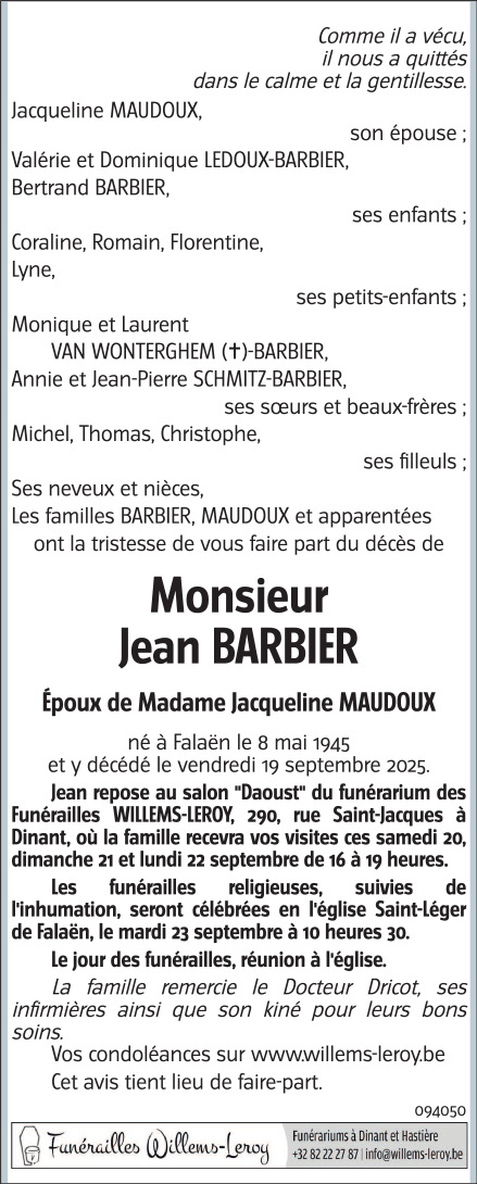 Décédé à Falaën (5522, Belgique) le vendredi 19 septembre 2025 à l'âge de 80 ans