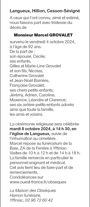 Décédé à Saint-Brieuc (22000) le vendredi 4 octobre 2024 à l'âge de 92 ans