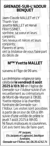 Overleden te Grenade-sur-l'Adour (40270) op vrijdag 1 augustus 2025 op 99-jarige leeftijd