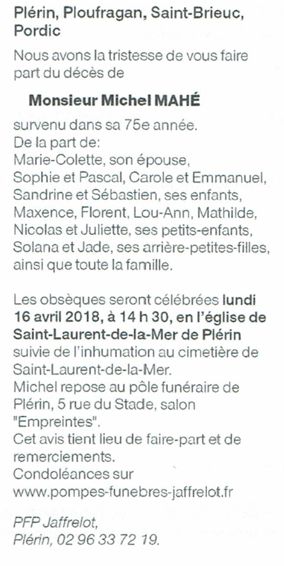 Décédé à Plérin (22190) le jeudi 12 avril 2018 à l'âge de 74 ans