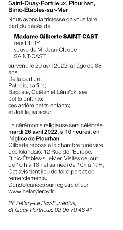 Veuve de Monsieur Jean-Claude SAINT-CAST