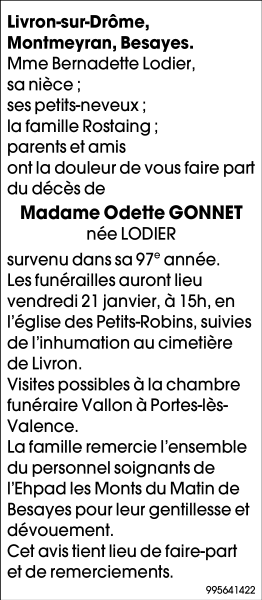 Décédée à Bésayes (26300) le vendredi 14 janvier 2022 à l'âge de 97 ans