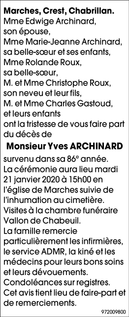 Décédé à Marches (26300) le jeudi 16 janvier 2020 à l'âge de 85 ans