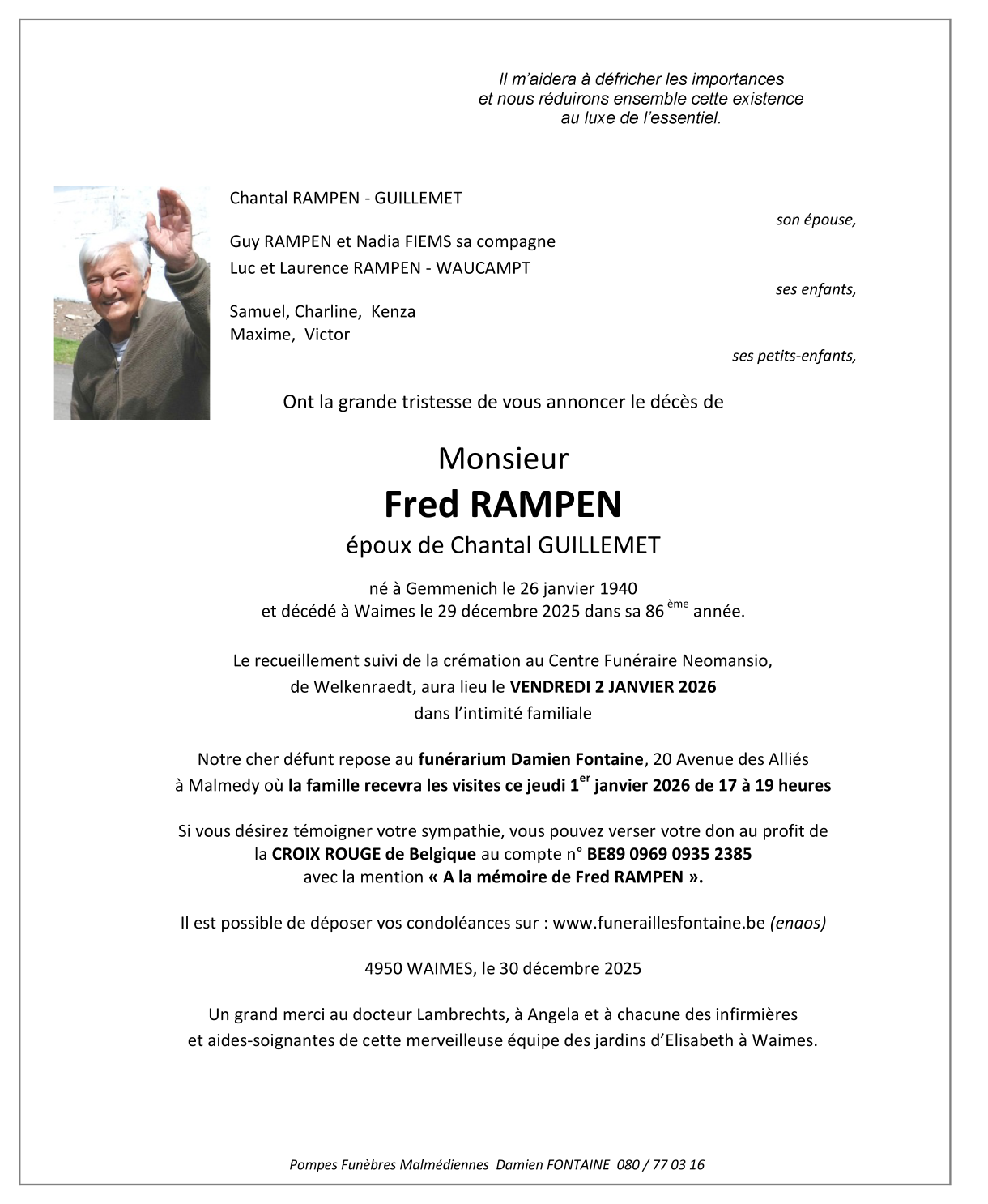 Décédé à Waimes (4950, Belgique) le lundi 29 décembre 2025 à l'âge de 85 ans