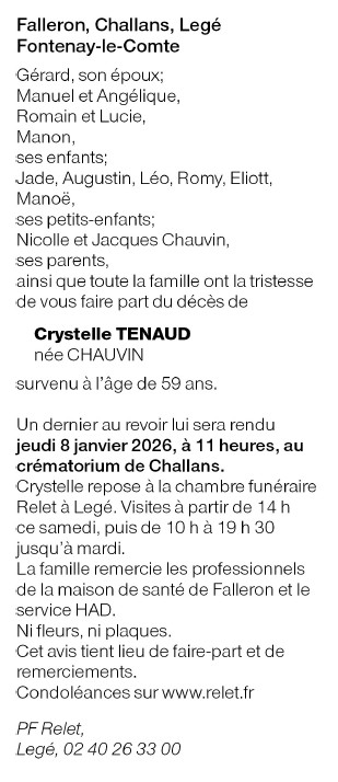 Décédée à Falleron (85670) le vendredi 2 janvier 2026 à l'âge de 59 ans