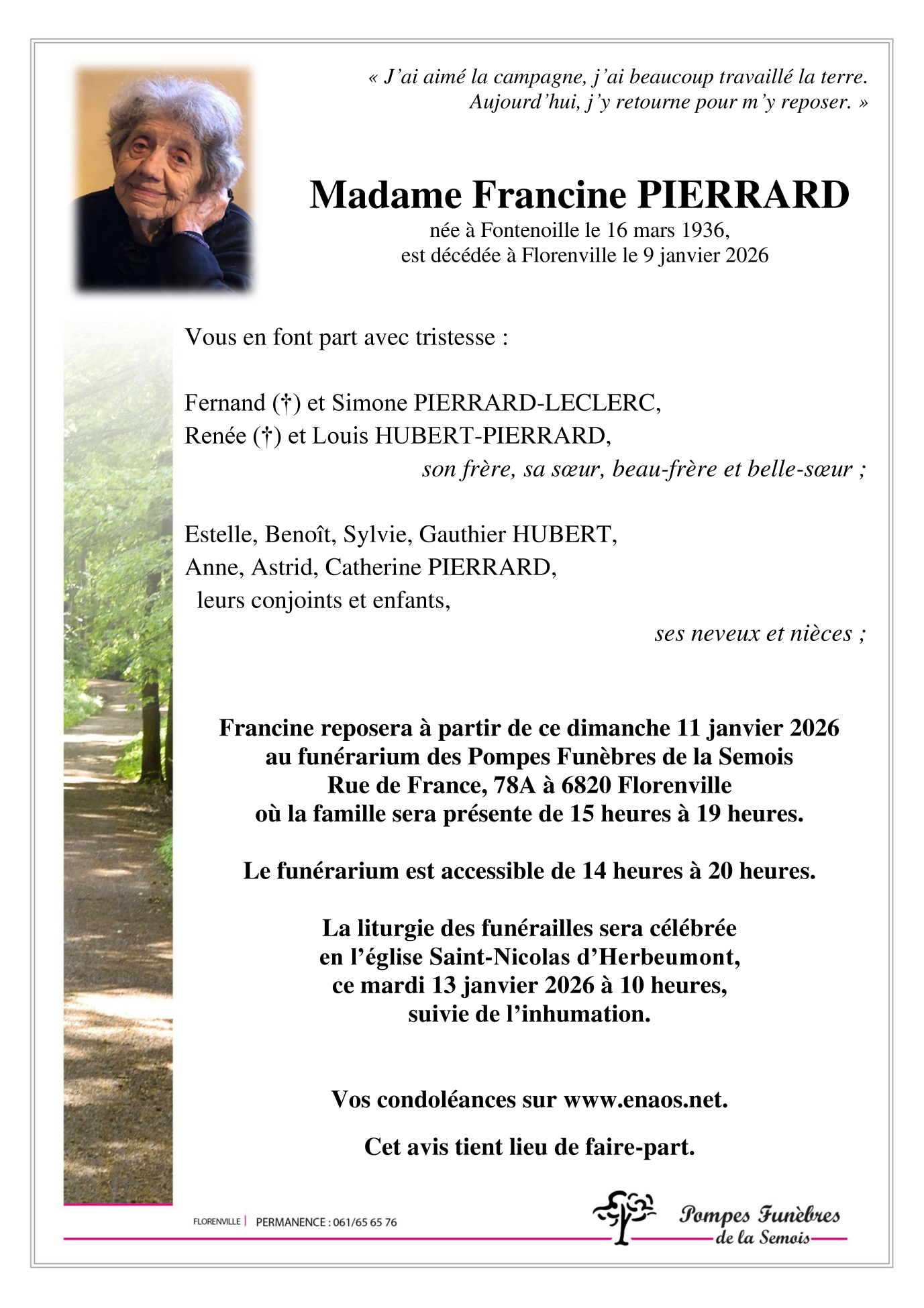 Décédée à Florenville (6820, Belgique) le vendredi 9 janvier 2026 à l'âge de 89 ans