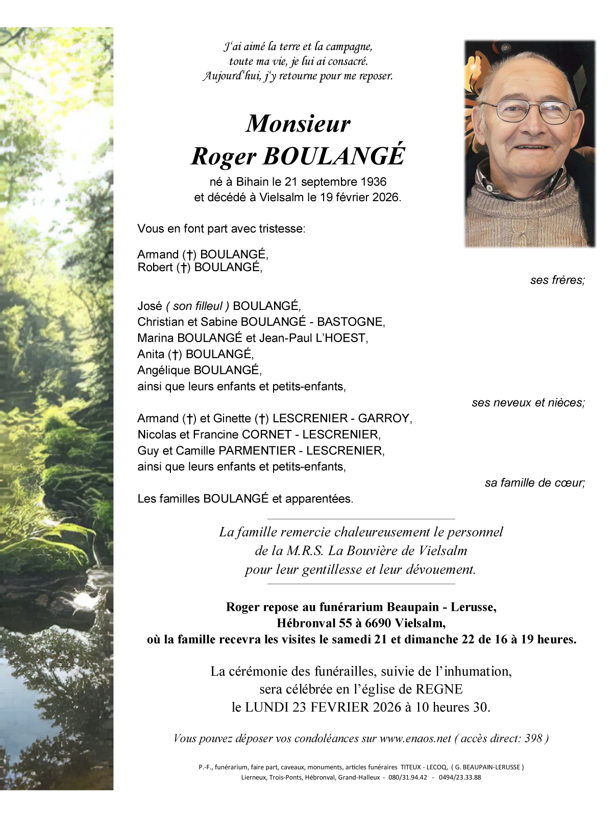 Died in Vielsalm (6690, Belgium) on 19 February 2026 at the age of 89 years