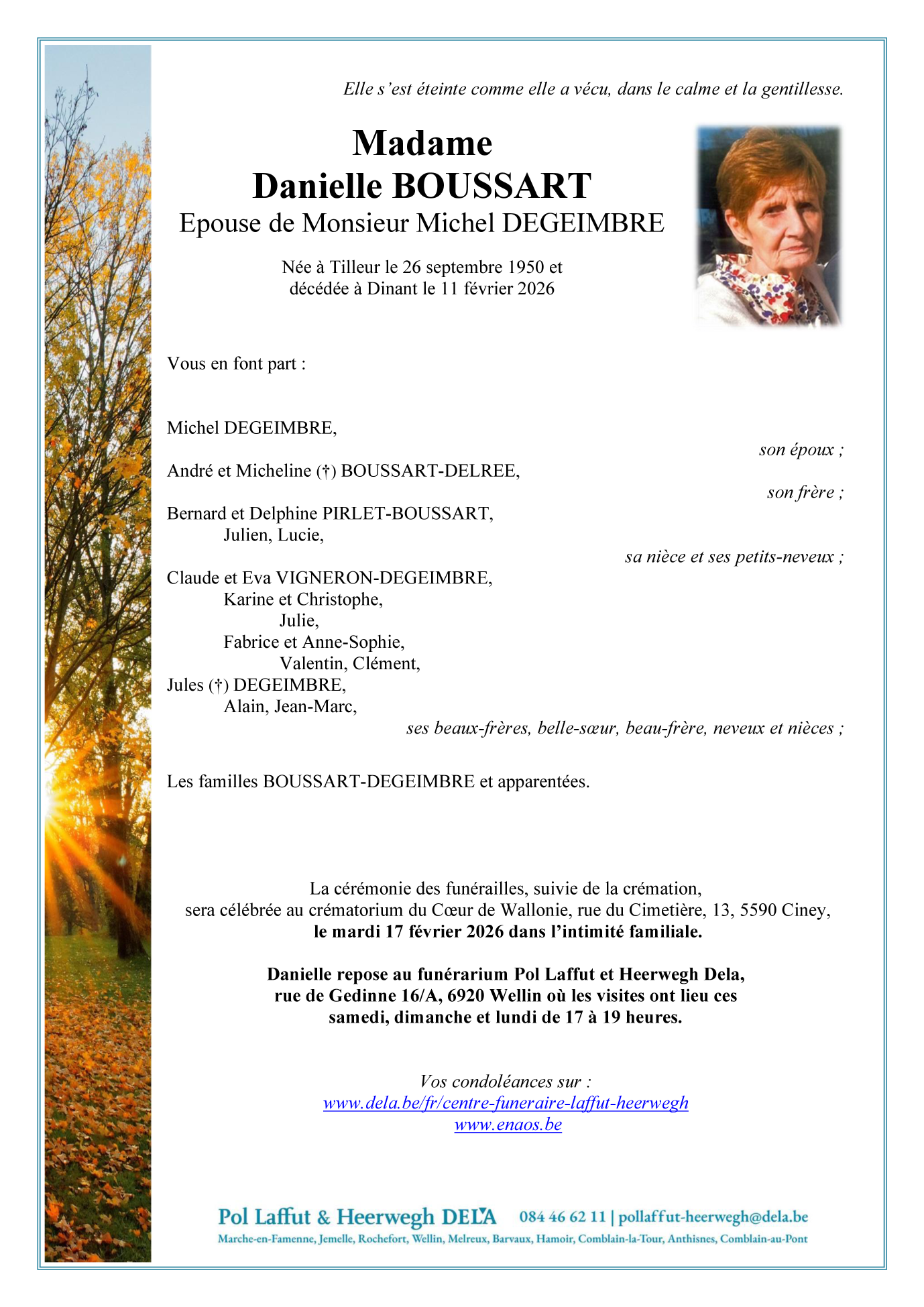 Fallecida en Dinant (5500, Bélgica) el miércoles, 11 de febrero de 2026 a la edad de 75 años