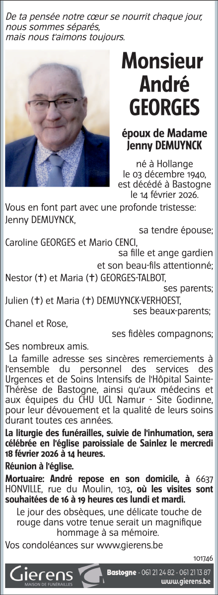 Died in Bastogne (6600, Belgium) on 14 February 2026 at the age of 85 years
