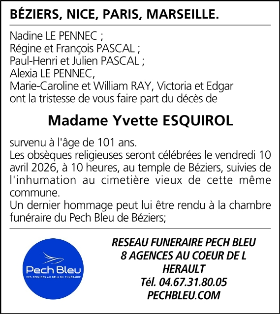 Died in Béziers (34500) on 06 April 2026 at the age of 101 years