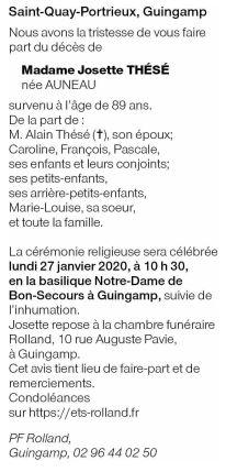 Décédée à Saint-Quay-Portrieux (22410) le mardi 21 janvier 2020 à l'âge de 89 ans