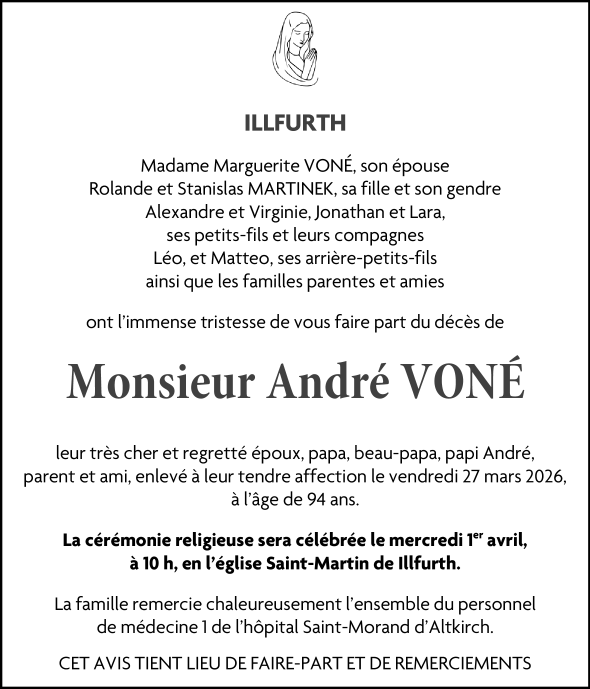 Décédé à Altkirch (68130) le vendredi 27 mars 2026 à l'âge de 94 ans