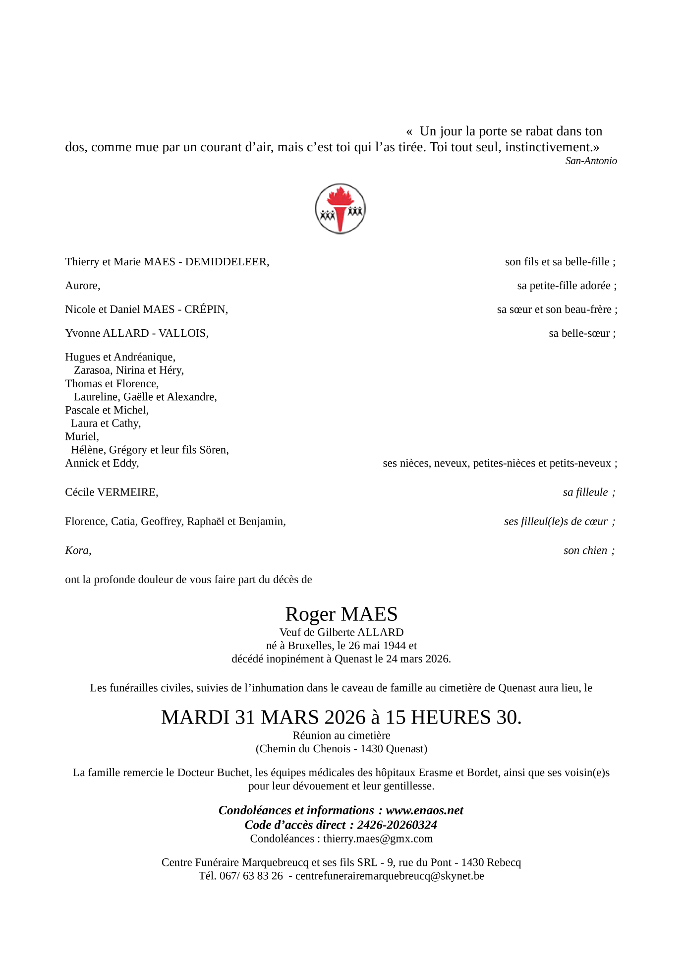 Fallecido en Rebecq (1430, Bélgica) el martes, 24 de marzo de 2026 a la edad de 81 años