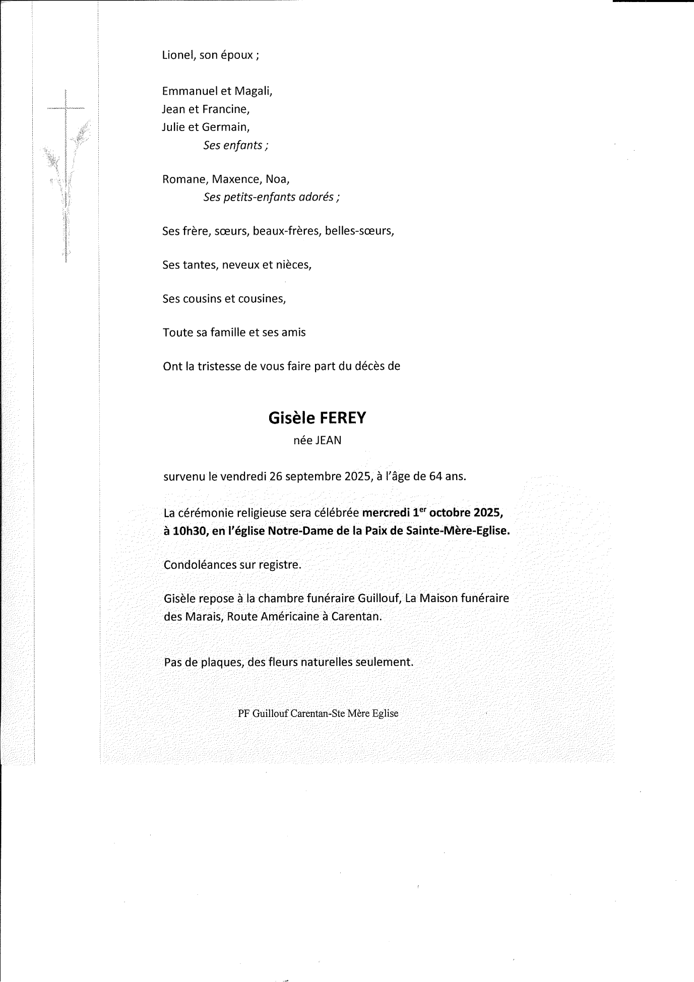 Décédée à Sainte-Mère-Eglise (50480) le vendredi 26 septembre 2025 à l'âge de 64 ans