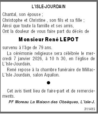 Décédé à L'Isle-Jourdain (86150) le mercredi 31 décembre 2025 à l'âge de 79 ans